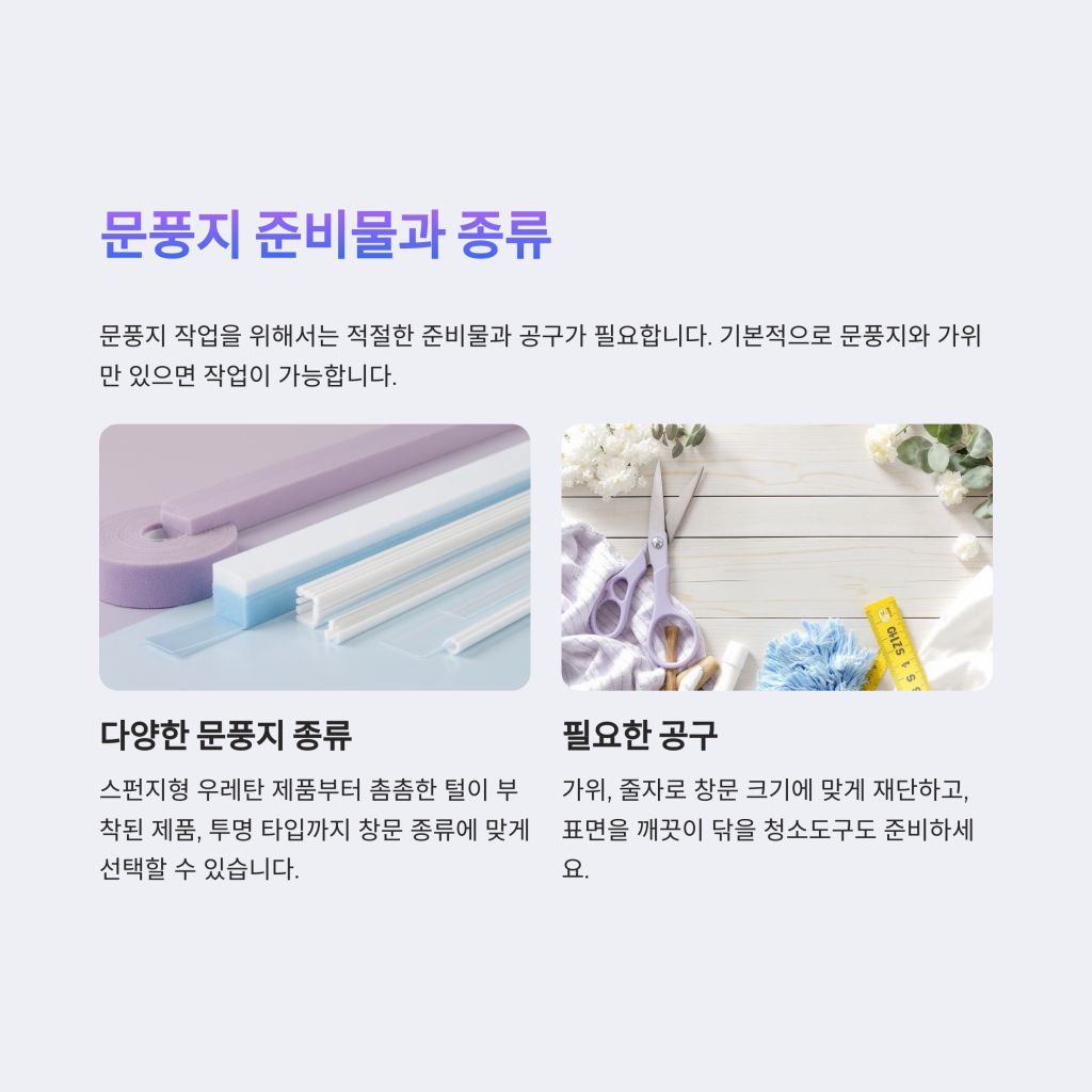 창문 문풍지를 붙이기 위해서는 준비물과 공구를 사전에 준비해야 합니다. 가장 기본적으로는 문풍지와 가위가 필요하며, 창문의 크기에 맞게 적당한 길이의 문풍지를 선택해야 합니다.